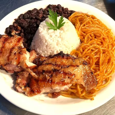 File de sobrecoxa feita na brasa com arroz soltinho, feijão e macarrão. Uma delicia