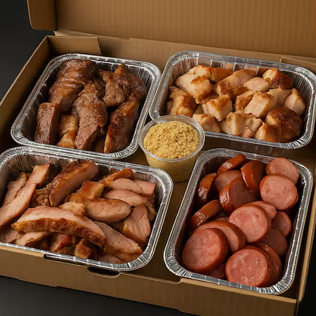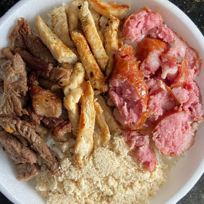 Arroz soltinho, feijão bem temperado, farofa da casa, File de sobrecoxa na brasa, Linguiça toscana e pernil na brasa. (600g)