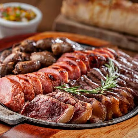 500g de Contra file suculento, File de sobrecoxa na brasa, linguiça toscana e pernil.