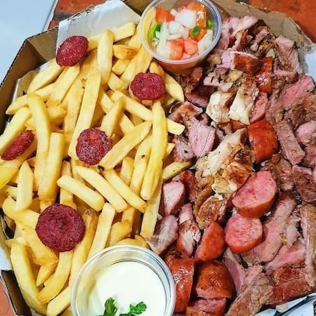 Contra file suculento, paleta suina, fatias de linguiça deliciosas e frango feito na brasa acompanhado com aquela batata frita crocante e finas fatias de calabresa...