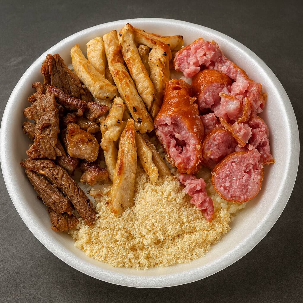 Criado para os amantes de churrasco ! Contra file bem macio, frango na brasa, Paleta suina suculenta, deliciosas fatias de linguiça. Acompanha vinagrete, farofa caseira ou maionese caseira !