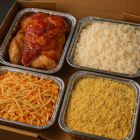 Delicioso frango com pele feito na brasa e um salpicão maravilhoso bastante recheado, farofa caseira e arroz de vó. 300g salpicão 300g Farofa 300g Frango na brasa cortado