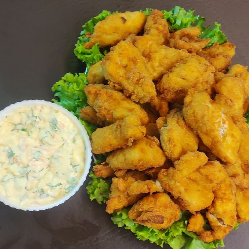 Isca de filé de peixe crocante empanados e fritos,acompanha molho especial.