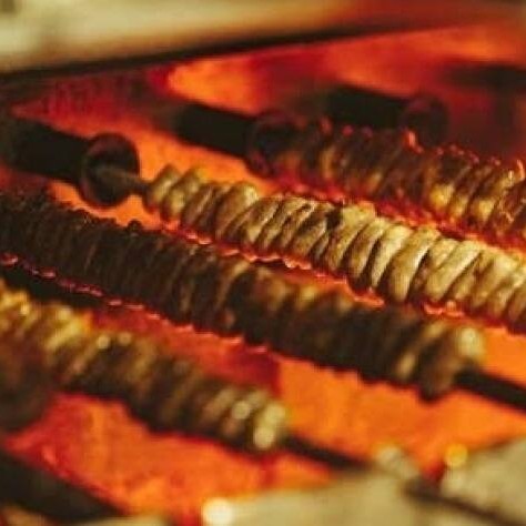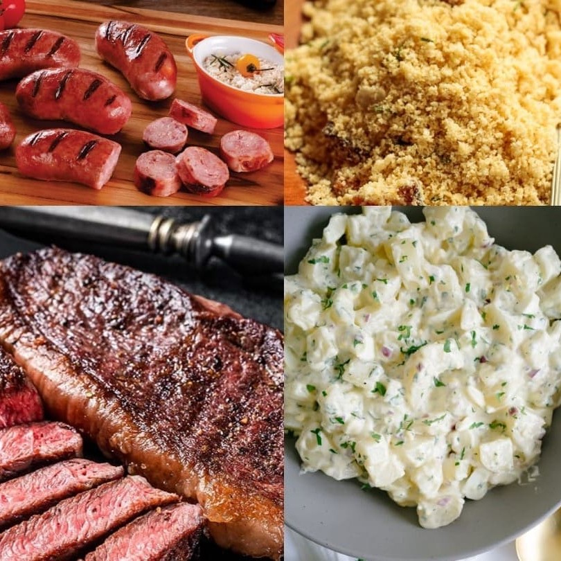 Arroz branco, feijão, macarrão, farofa, fritas, linguiça suína, frango, filé de alcatra, picanha suína e coracão