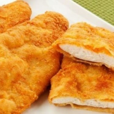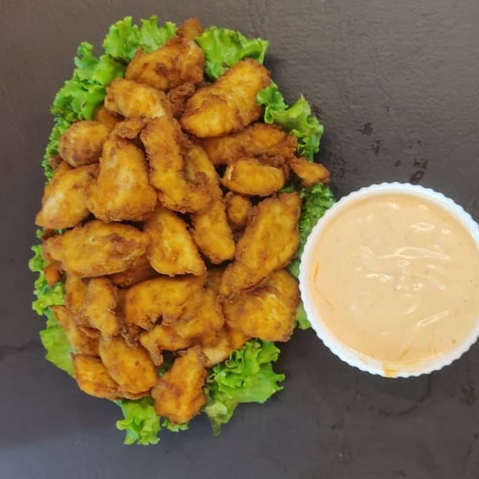 Tiras de peito de frango, marinados empanados e fritos, acompanha molho especial.