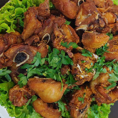 Cortes de frango a passarinho ricamente marinados e fritos.