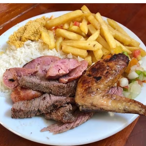 Churrasco Misto ( Arroz De Brocolis Ou Arroz Maluco, Feijão, Molho E Farofa).