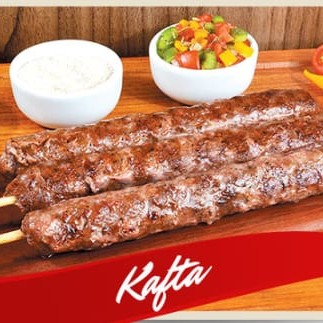 Pão de alho com uma generosa camada de pasta de alho com queijo e um espeto de kafta.