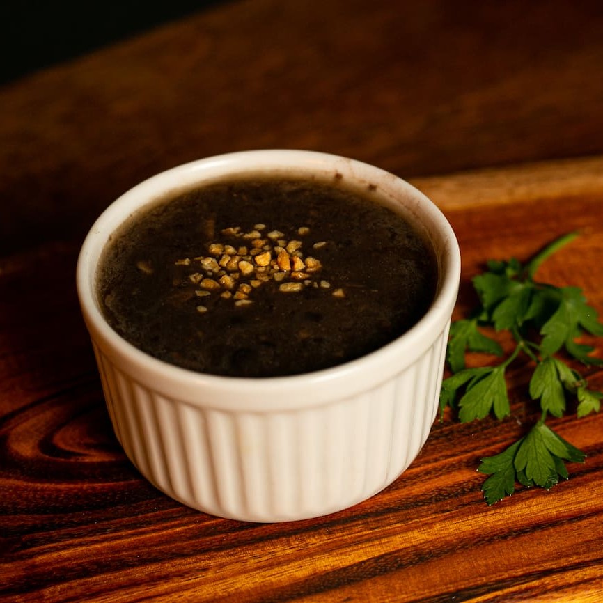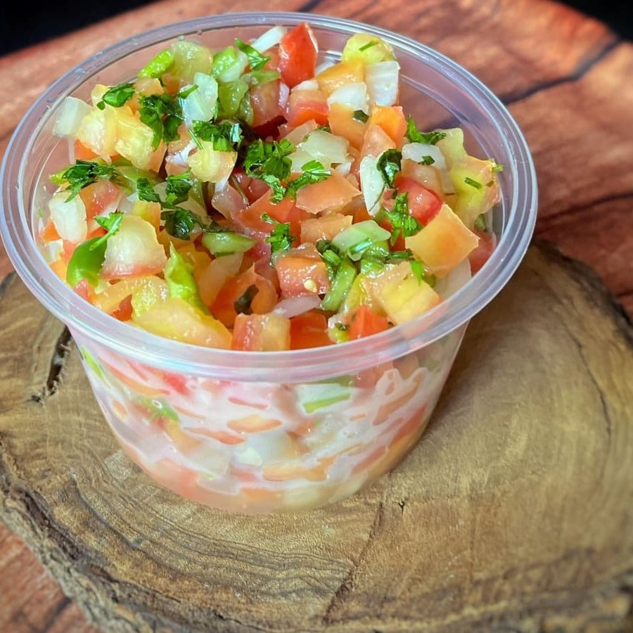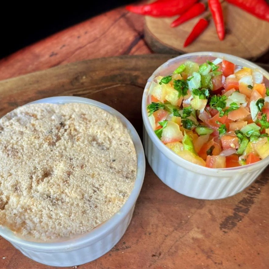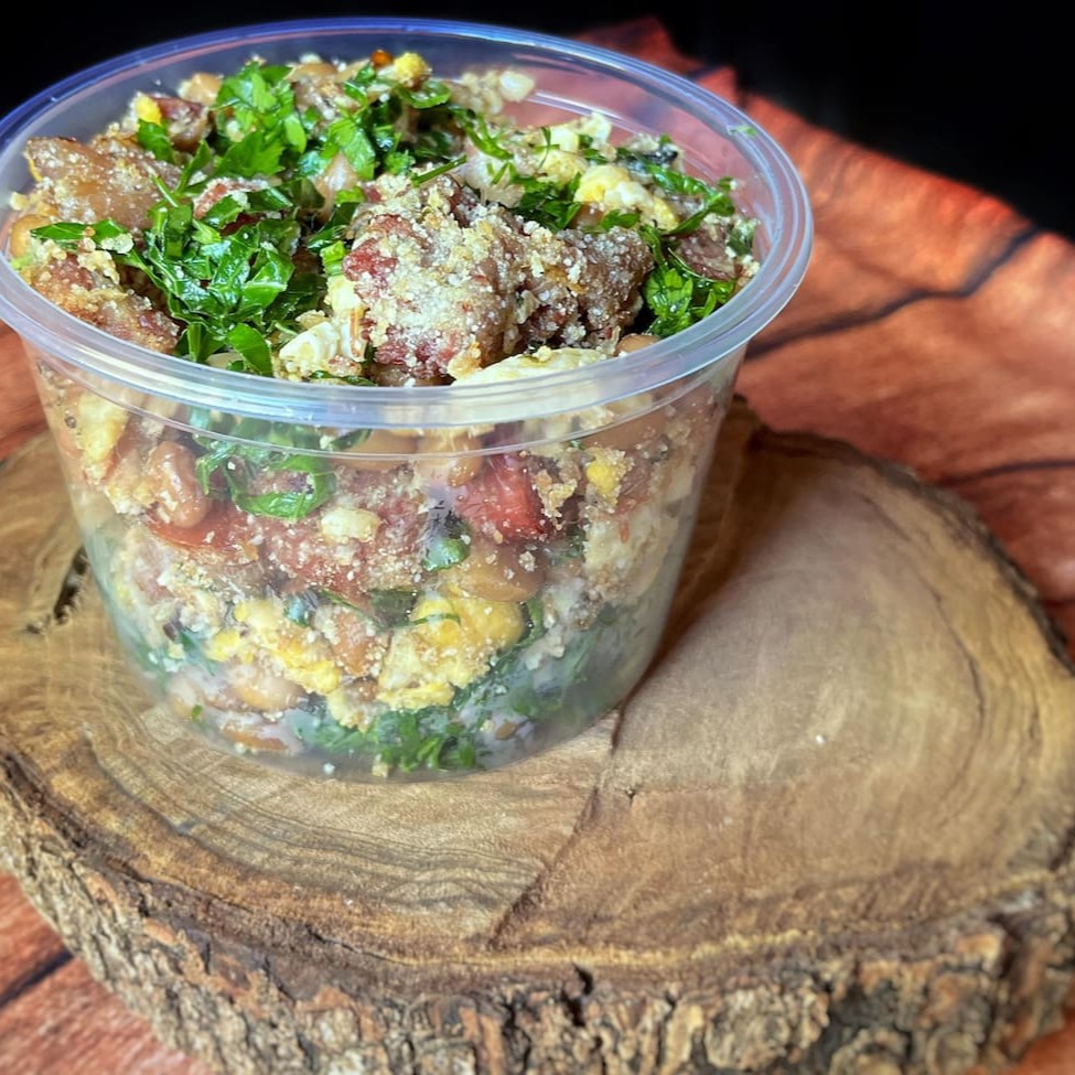 Feijão preto, linguiça calabresa, bacon, lombinho, carne seca, costelinha salgada. Acompanha arroz branquinho, couve mineira e farofinha. Pote de 500 gr. ( Não acompanha refrigerante )
