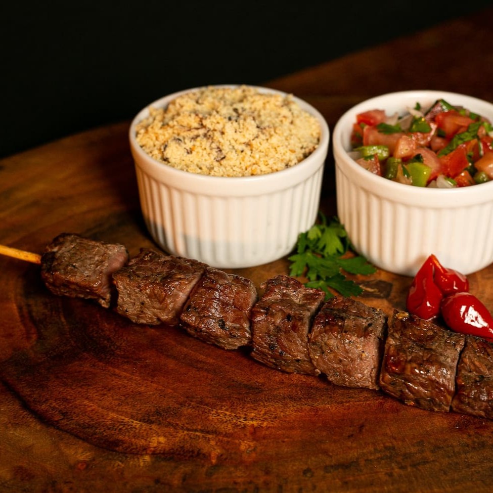 1 Espeto A Sua Escolha, Molho Á Campanha, Farofa E Pão De Alho Recheado Com Queijo