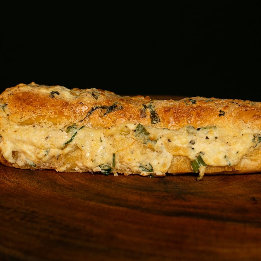 Pão de alho com uma generosa camada de pasta de alho com queijo e um espeto de peito de frango.