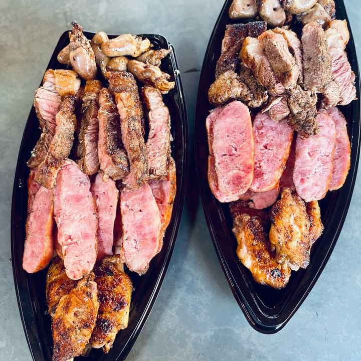 550G DE CHURRASCO NESSA BARCA VAI, MEDALHÃO DE FRANGO COM BACON, ASA DE FRANGO, CARNE DE PORCO, CARNE ( MOLHO E FAROFA)