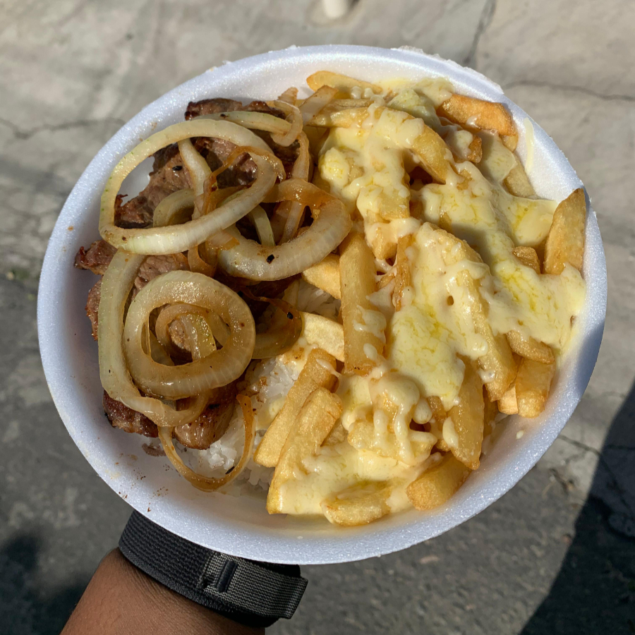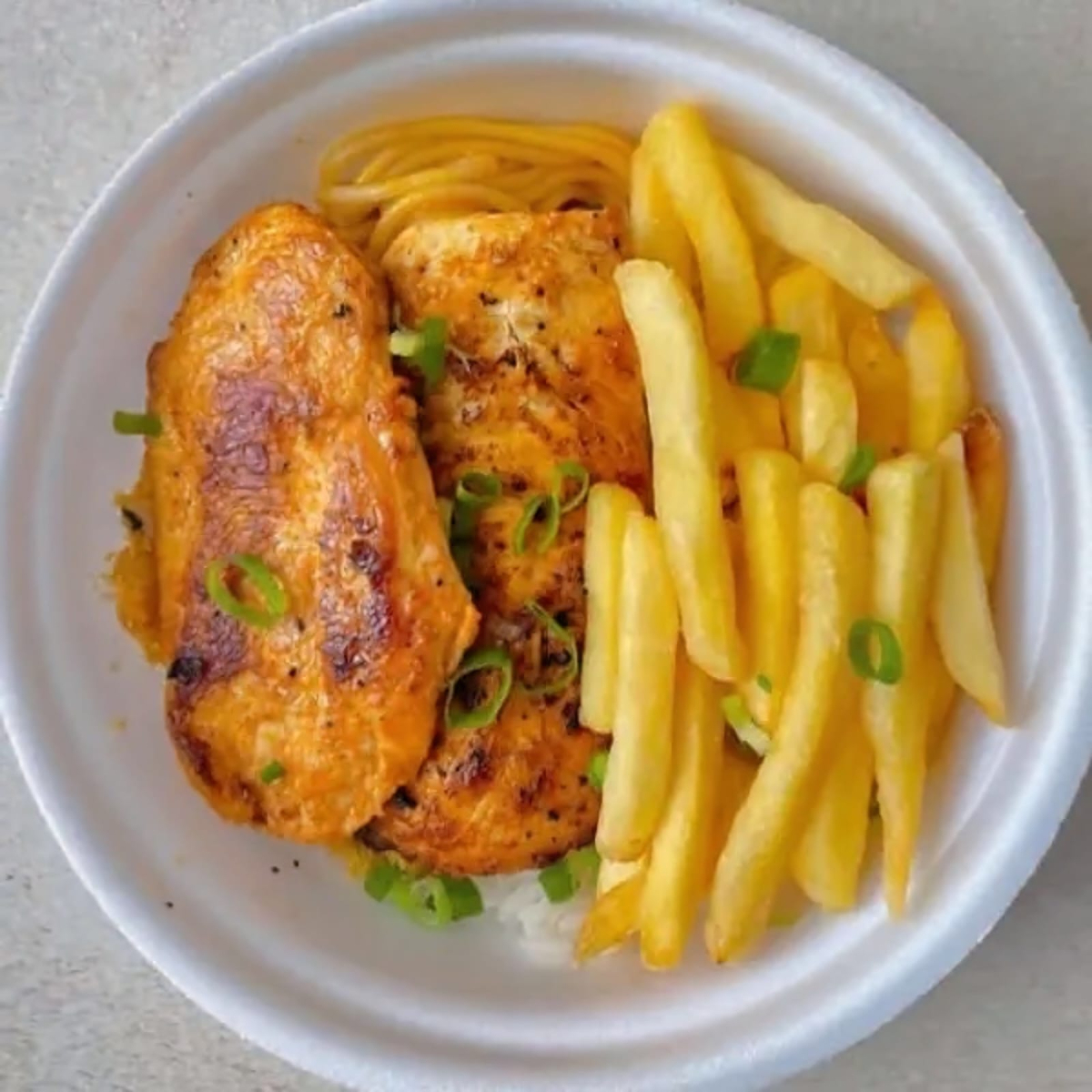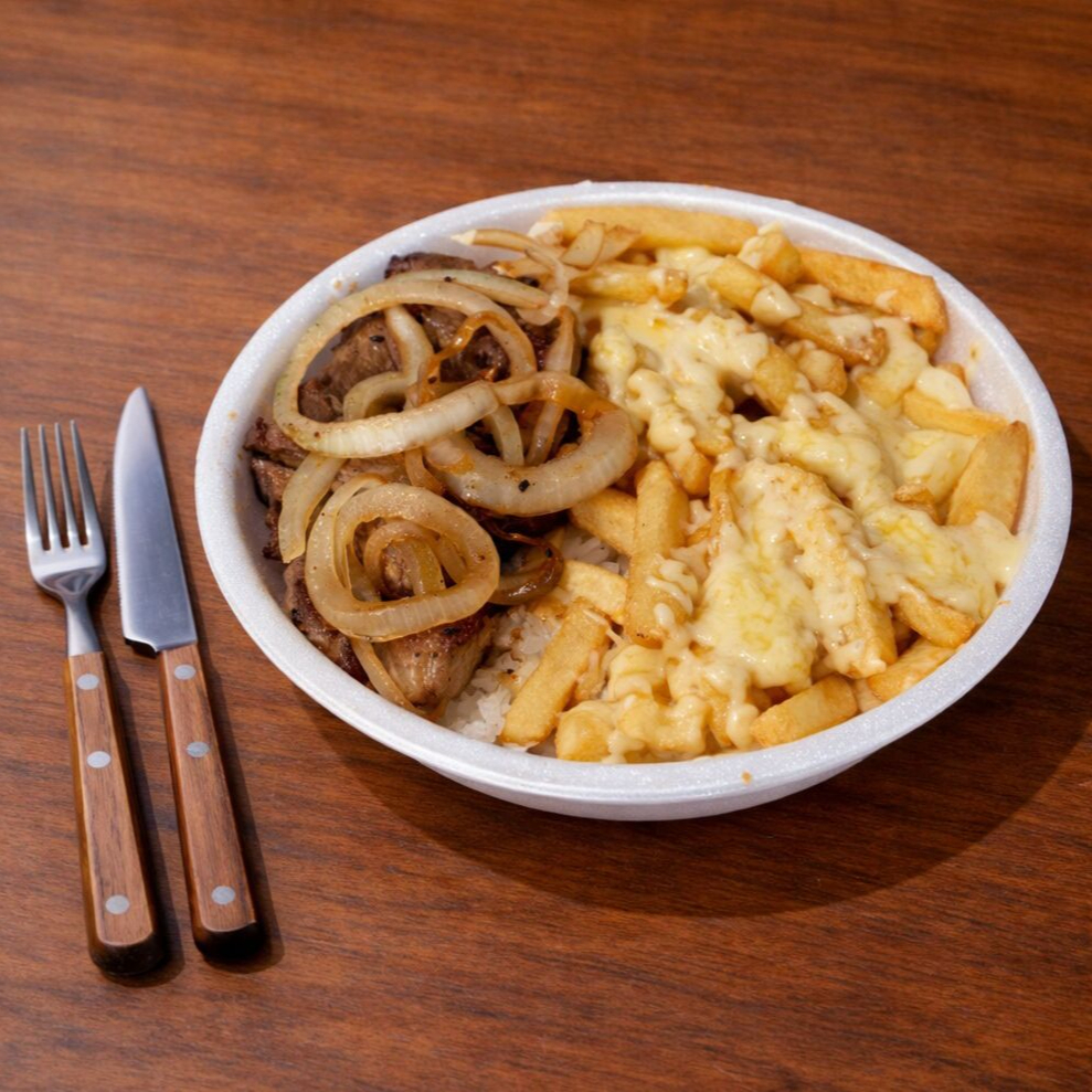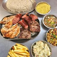 Nesse prato vai, arroz, feijão, 160g de churrasco MISTO( carne, frango, linguiça) e fritas