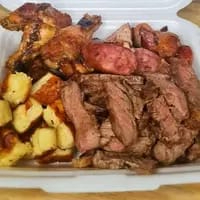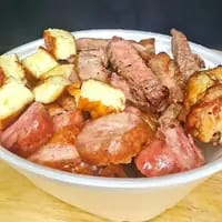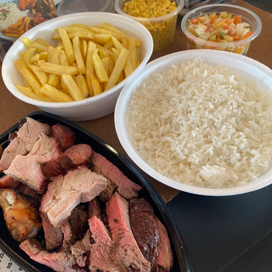 Nesse combo vai 500g de churrasco (MISTO) Arroz grande, batata frita grande, farofa e molho da casa