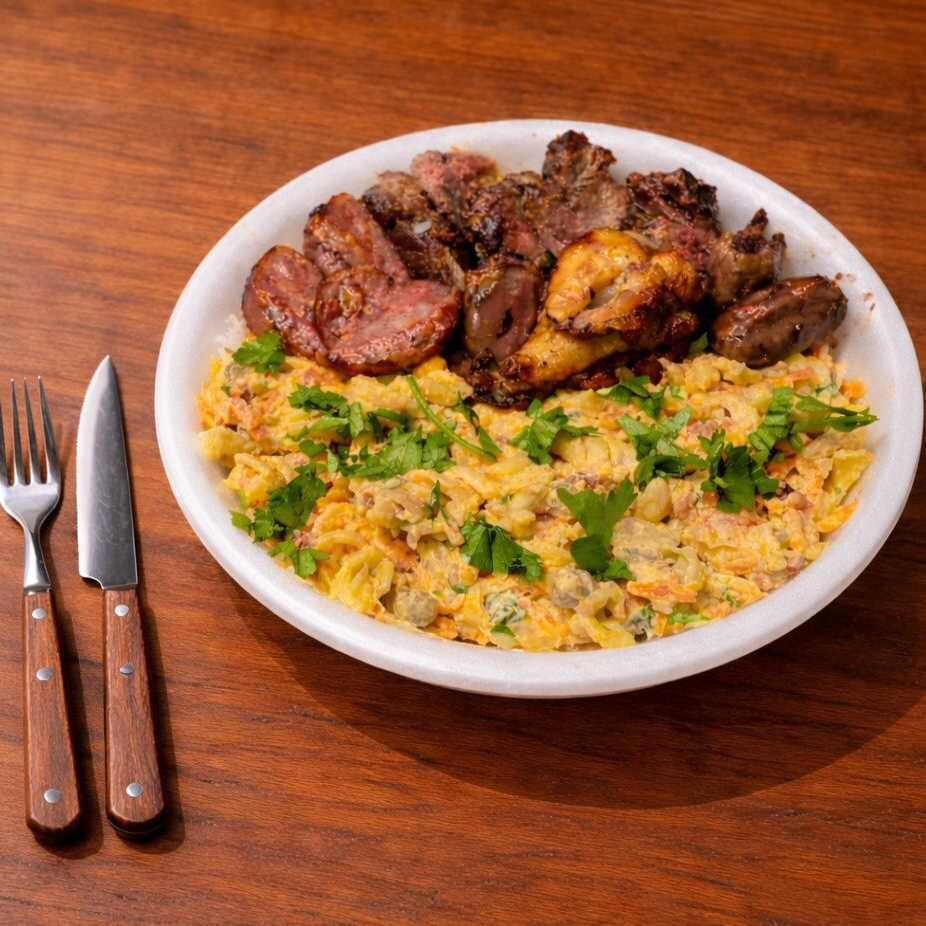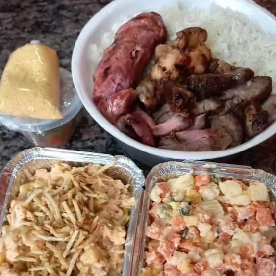 Neste prato acompanha arroz, 350g churrasco (frango,linguiça ,carne bovina,carne suína,coração) mais 2 guarnicoes a sua escolha !!!!!