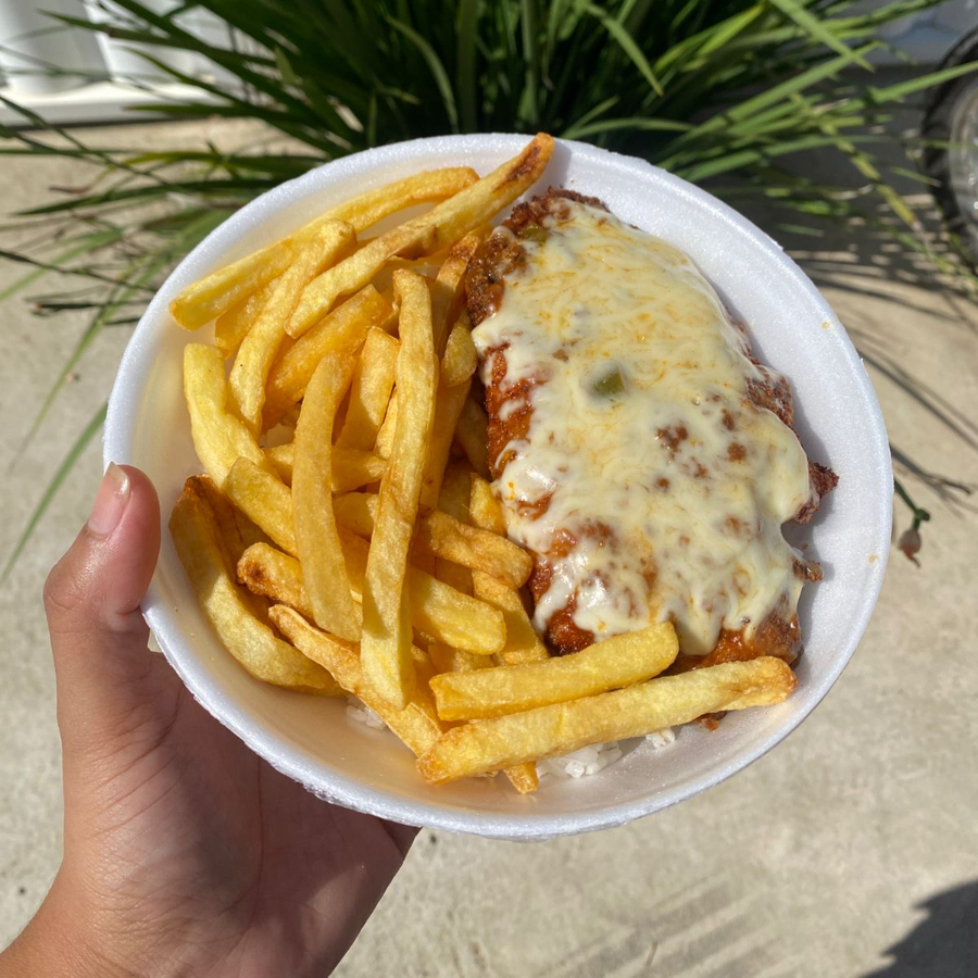 Frango a parmegiana com 3 acompanhamentos