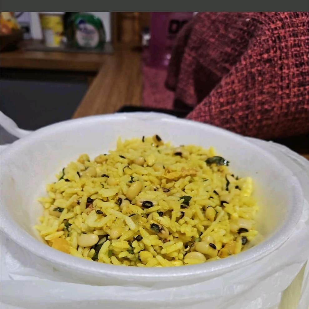 Uma quentinha de isopor n 8 com baião de dois,com queijo Coalho, calabresa, bacon, arroz, feijão fradinho, coentro e especiarias. Bem servido