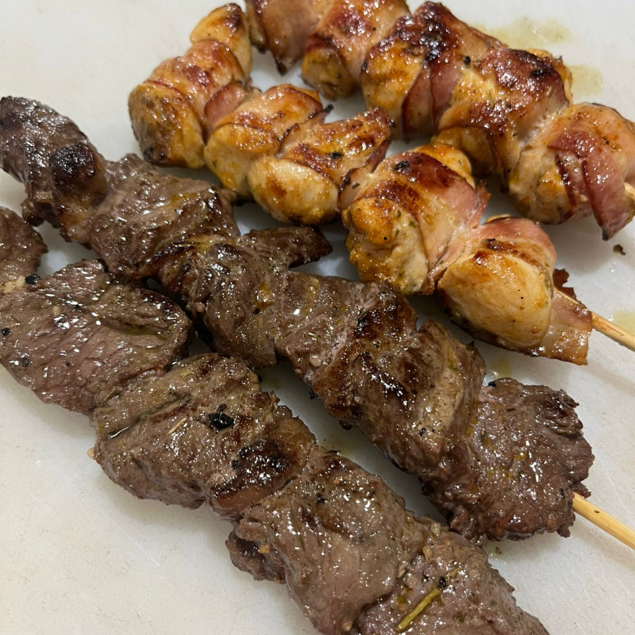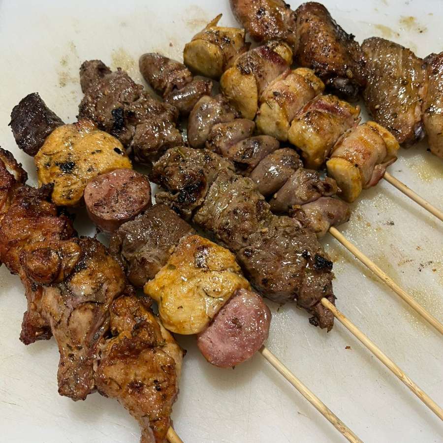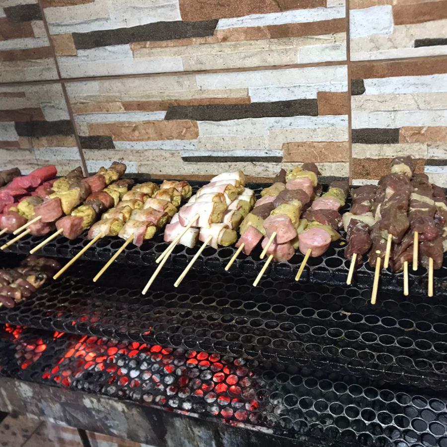 6 Espetos de sua preferencia, 1 Arroz branco soltinho (medio), Nossa deliciosa Farofa e Vinagrete.