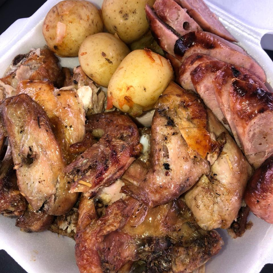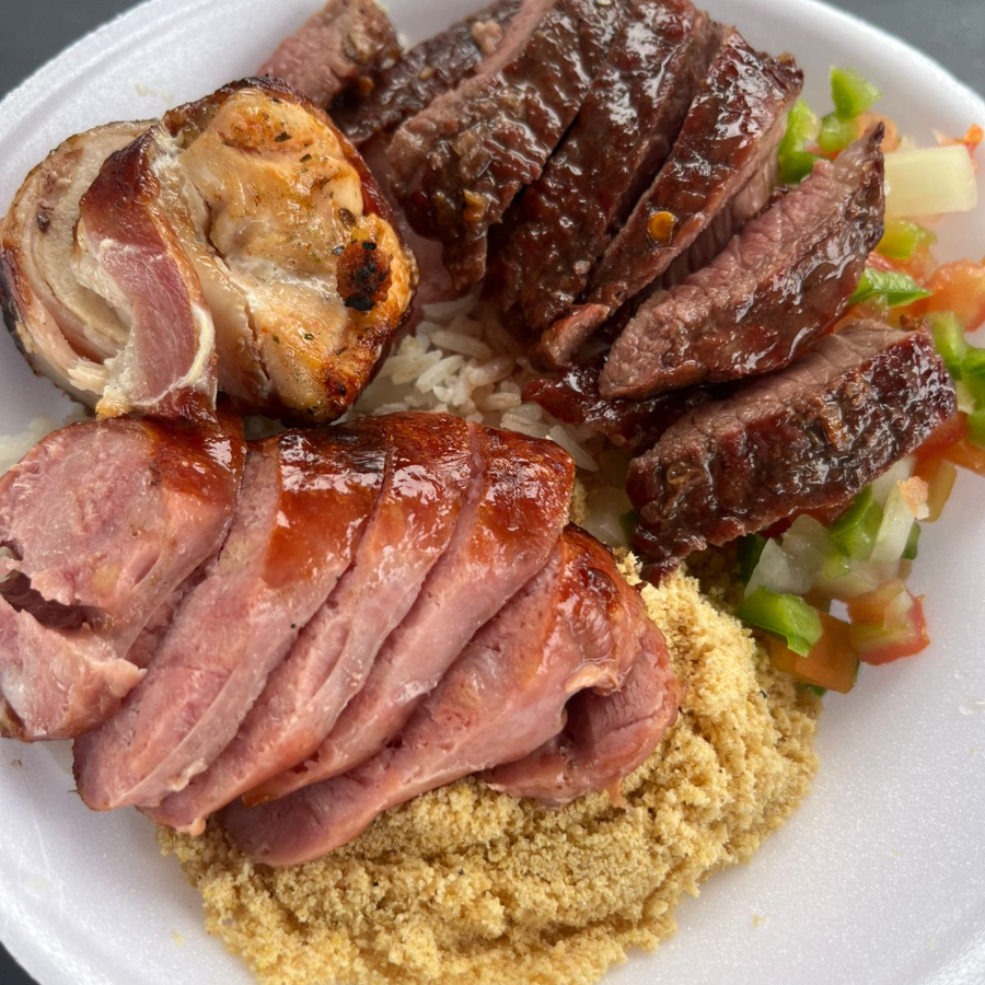 Linguiça toscana, linguiça de frango, medalhão de frango, asa, copa lombo e alcatra. Acompanha 1 Arroz grande, Farofa e Vinagrete.