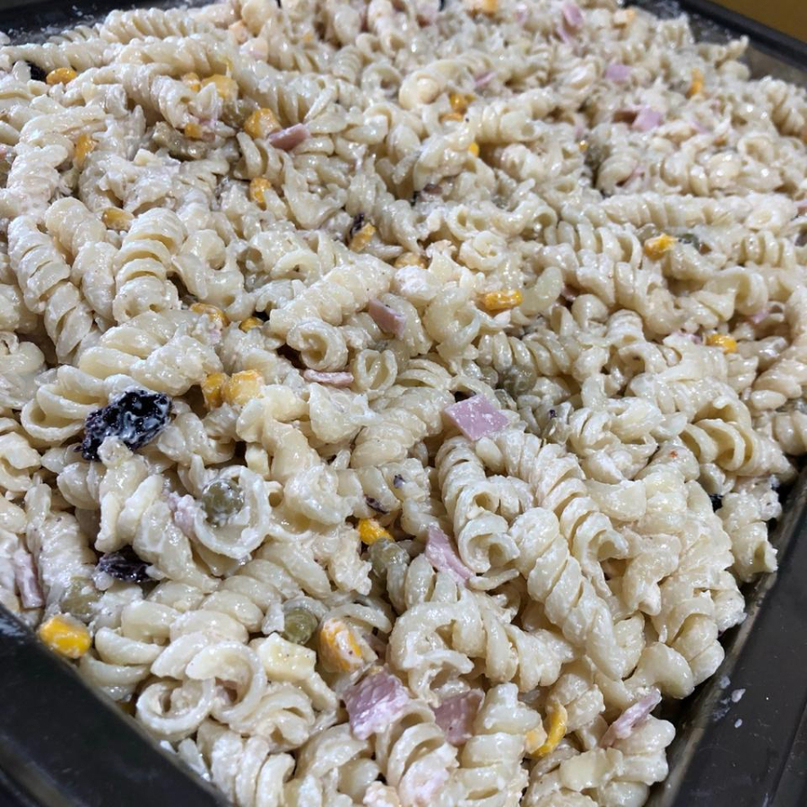 macarraõ, maionese, alho, queijo, presunto, azeitona, uva passa e milho.