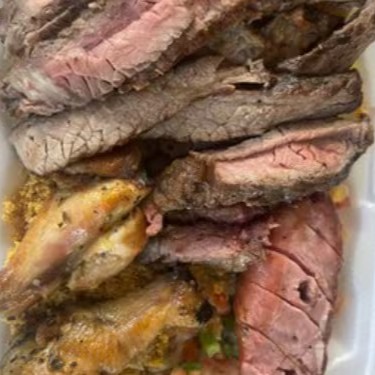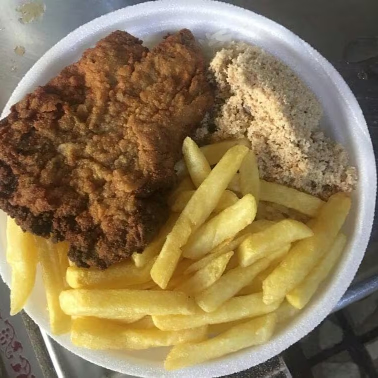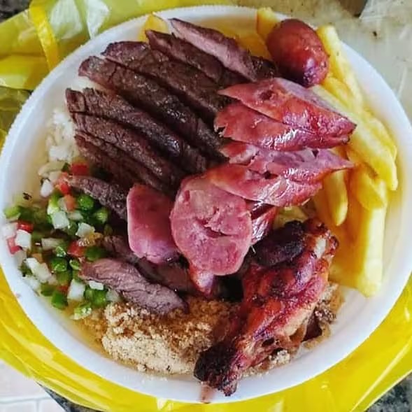 Arroz, feijão, molho, farofa, maionese, drumet, linguiça suina e carne (serve 2 pessoas)