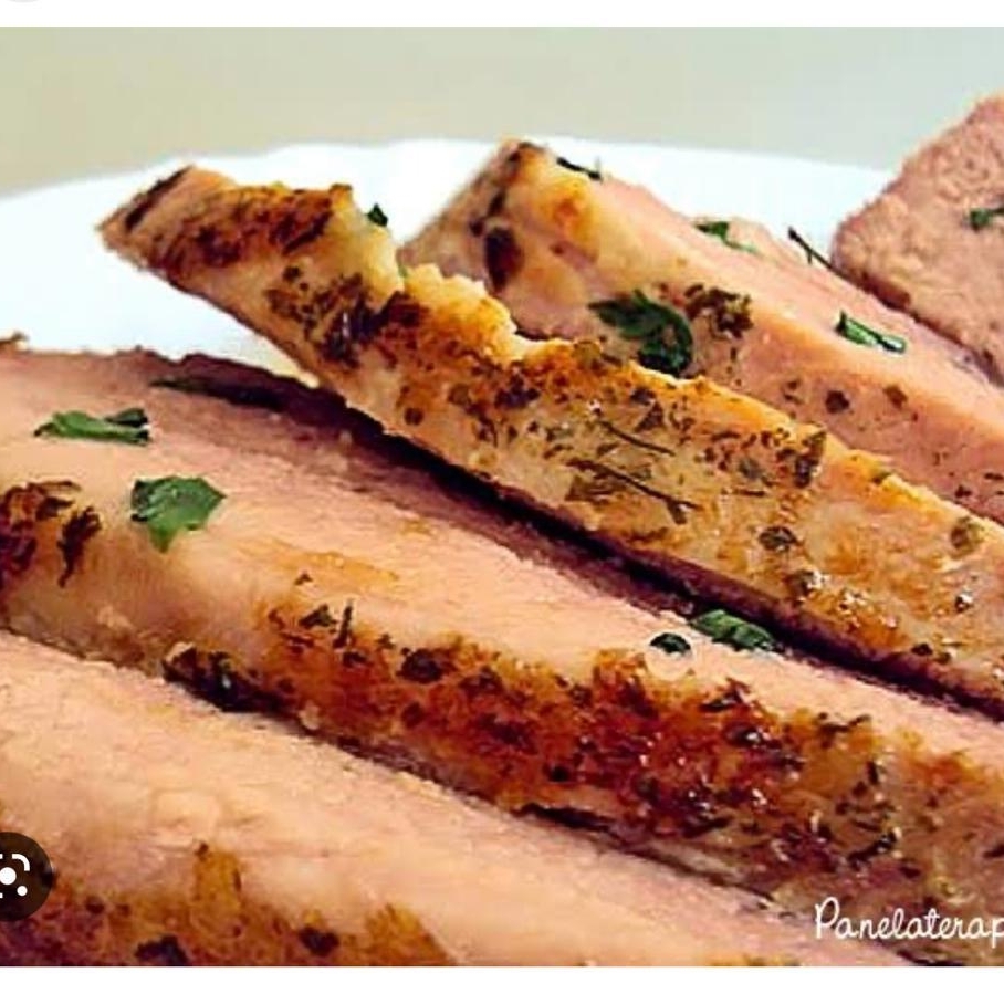 Arroz, feijão, farofa, fritas e picanha suina com molho barbrcue