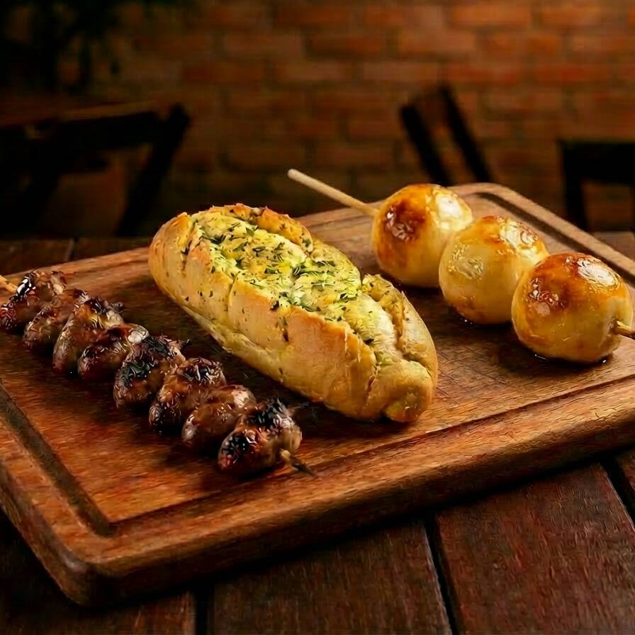 Um espeto de coração + 1 espeto com queijo mussarela de búfala + 1 Pão de alho