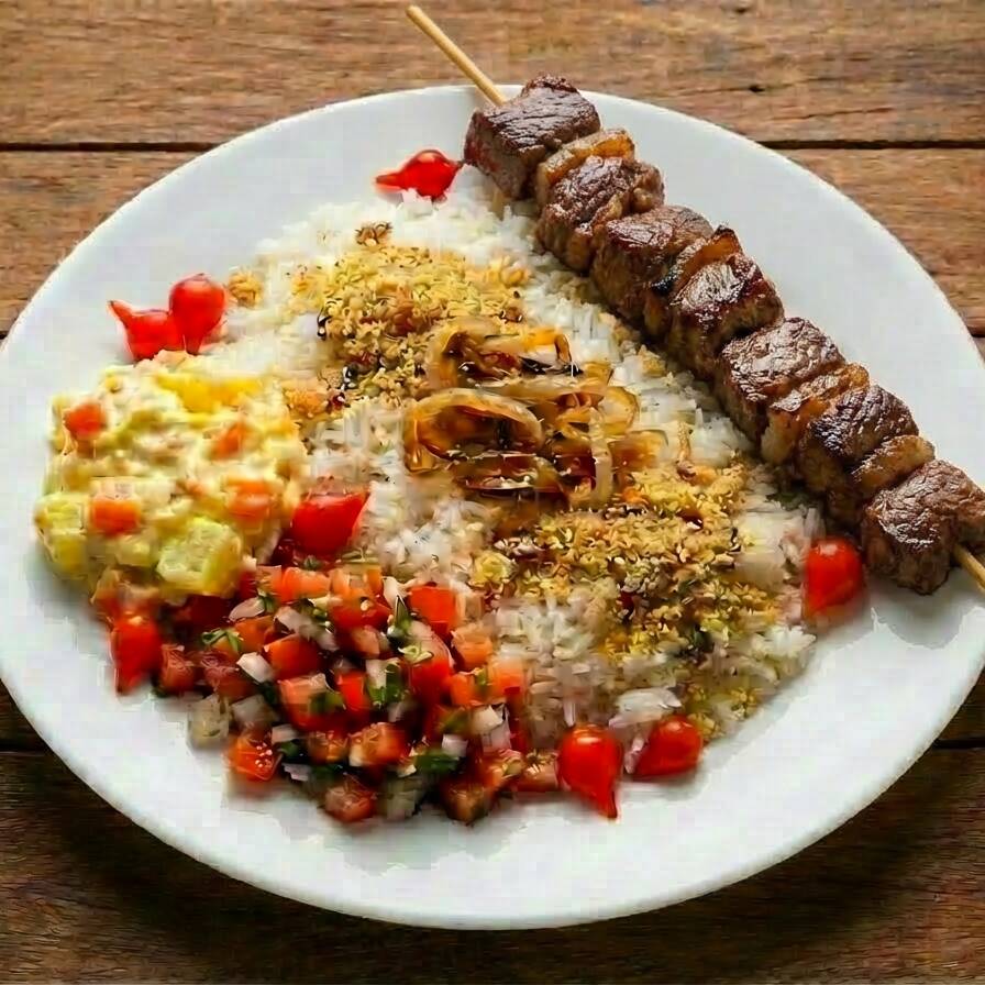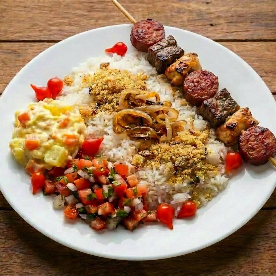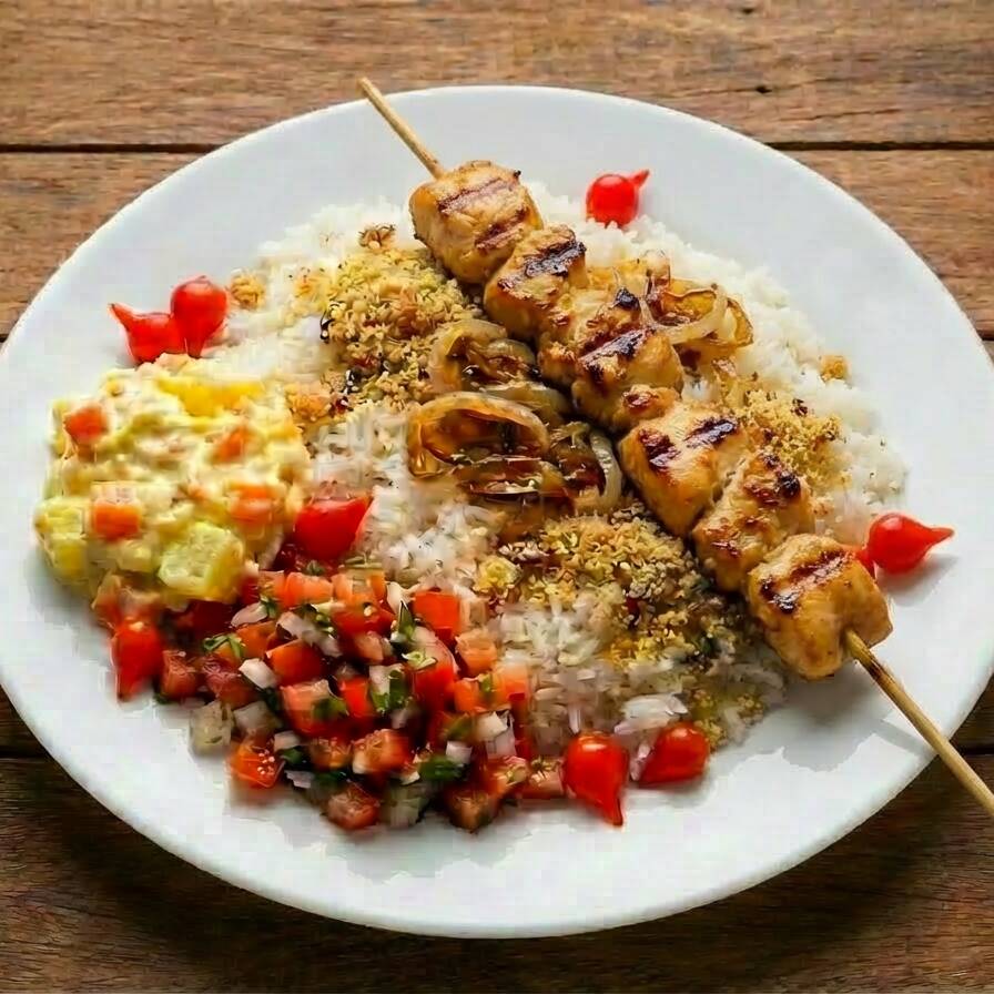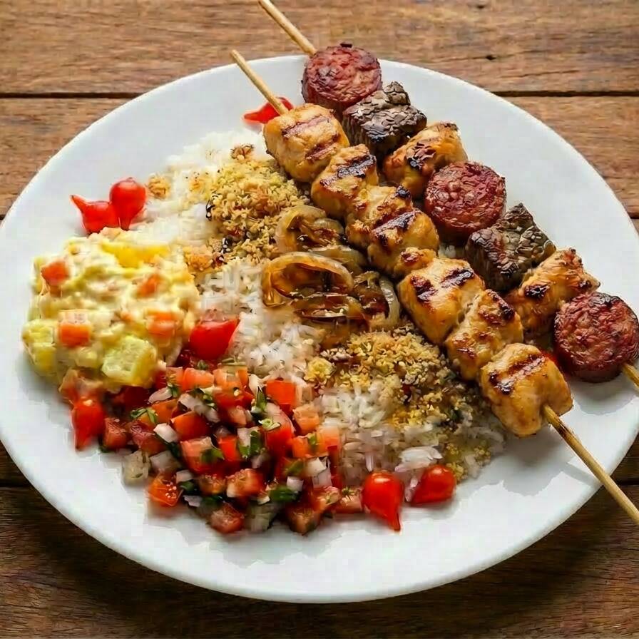 Espeto Misto(Carne, Linguiça Mineira e Frango) Arroz + Farofa + Molho + Maionese