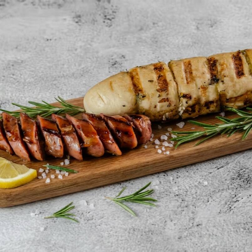 Linguiça toscanas grelhadas na brasa servidas com pão de alho da casa