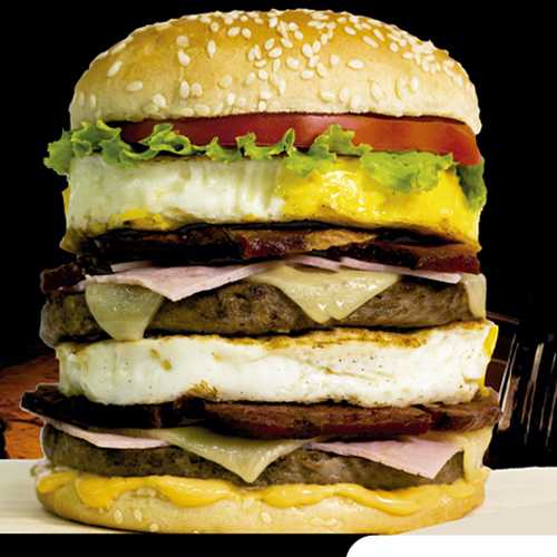Pão, 3 Carne, 3 Queijo, Bacon, Calabresa, Cheddar, Catupiry, Salada, maionese e ketchup