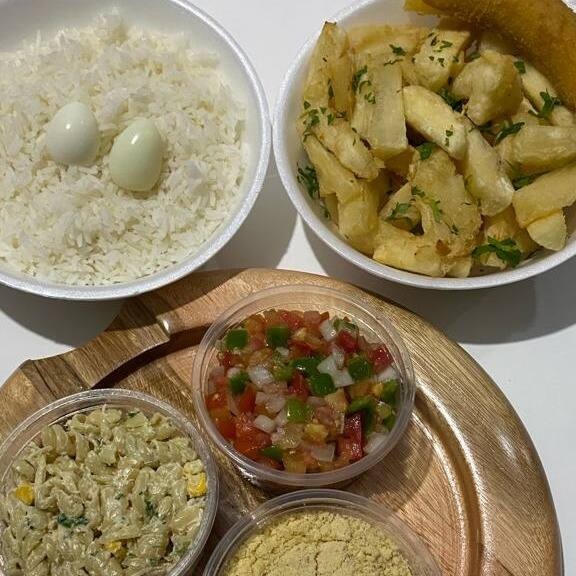 Aipim frito,arroz,molho,maionese ou macarronese,farofa,banana,2 ovos de codorna e um espeto