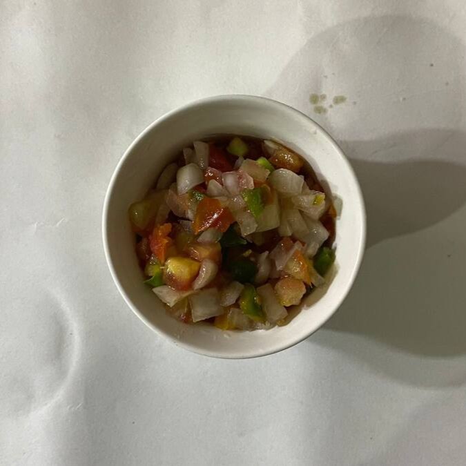 Batata frita,arroz,molho,maionese ou macarronese,farofa,banana,2 ovos de codorna e um espeto de R$ 7,00.