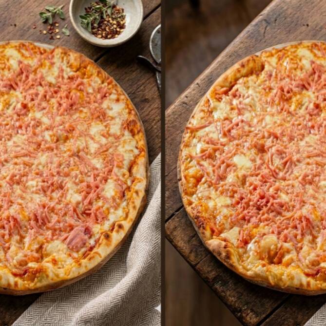 Pizza 30cm recheada com presunto fatiado e queijo muçarela.