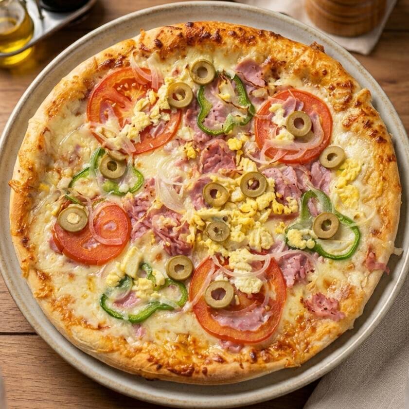 Pizza 30 cm com molho de tomate, presunto, cebola, azeitonas, ovos e queijo mussarela.