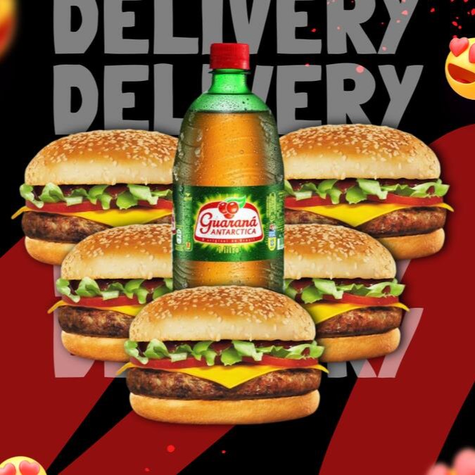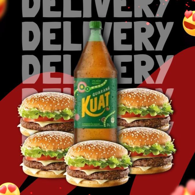 5 Hambúrgueres ( Pão, Carne, Salada, Ovo, Cheddar, Requeijão, Maionese de Alho e Batata Palha) + Batata (Bacon, Calabresa, Cheddar e Orégano) 2l