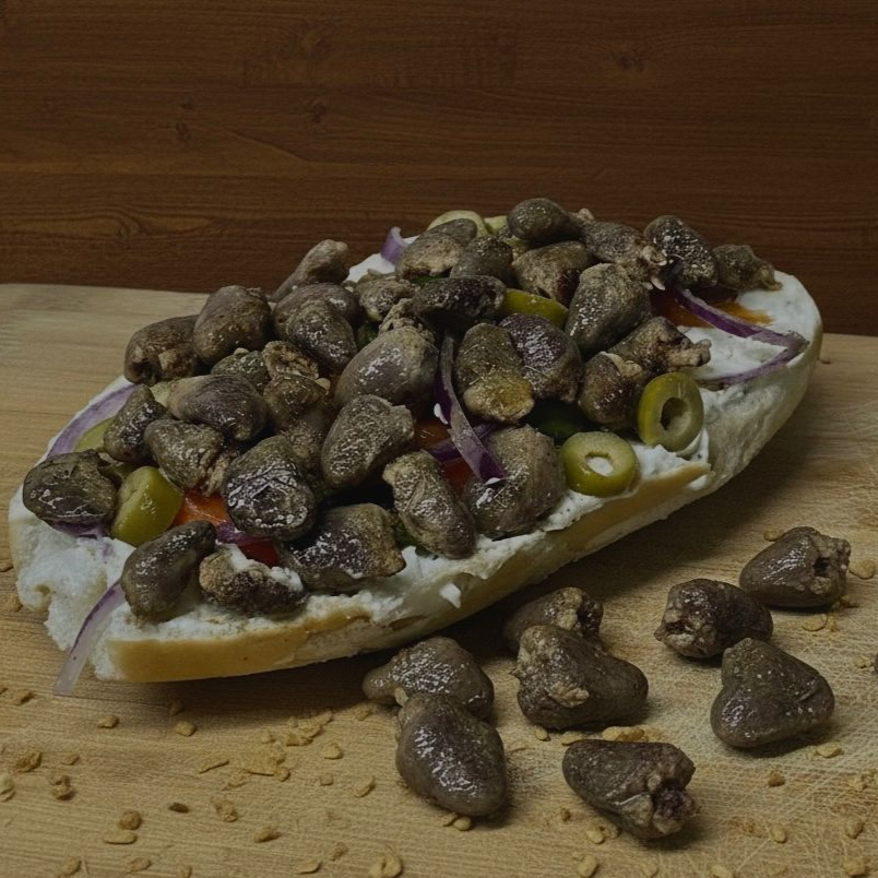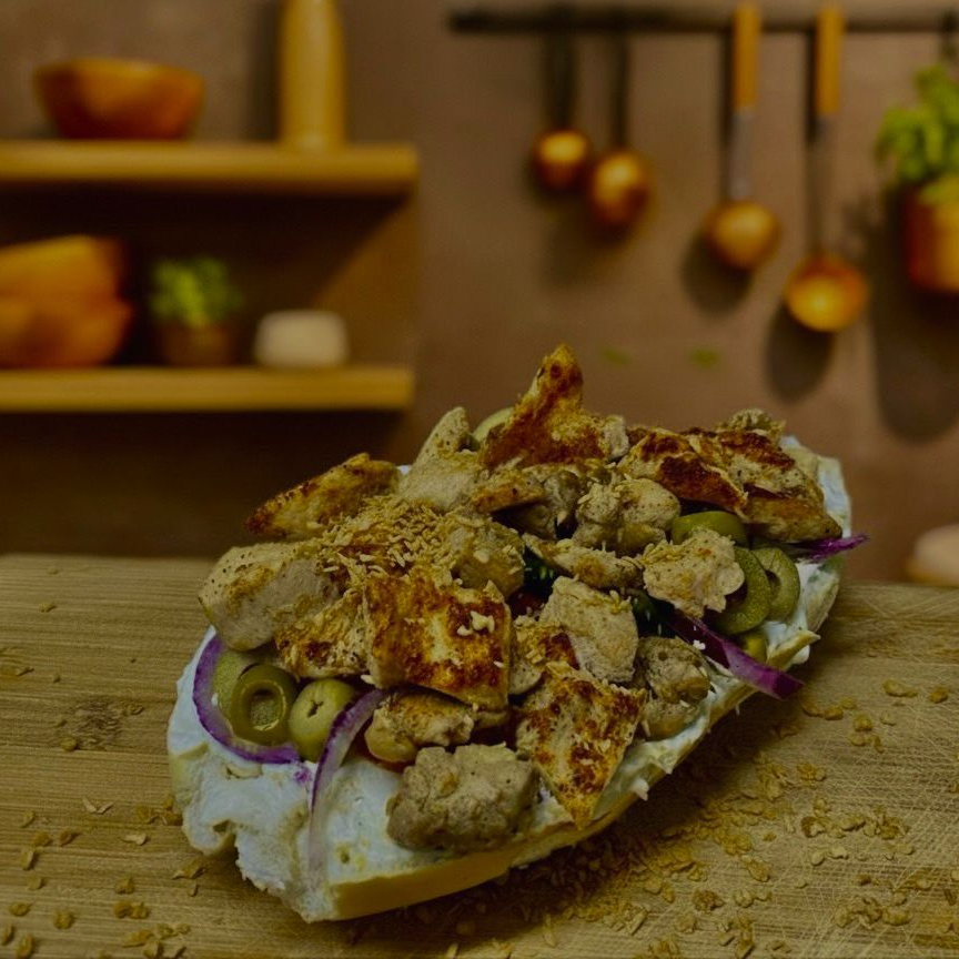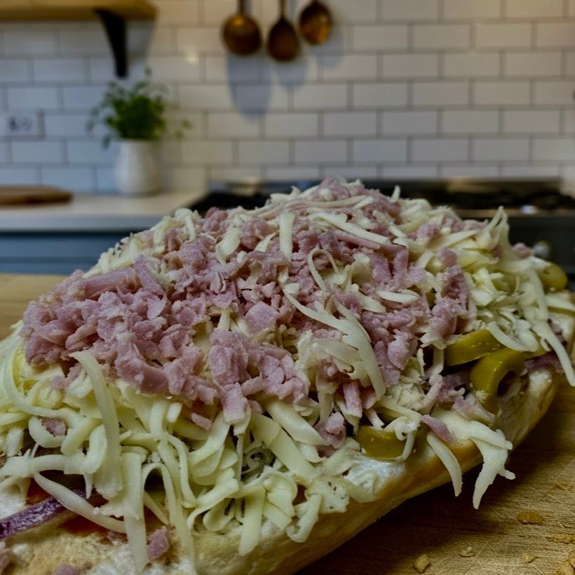 Pao , pasta de alho , tomate , cebola , pimentao , oregano , alho , torrado , azeitona