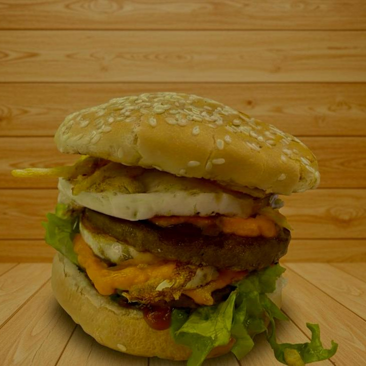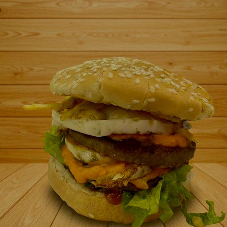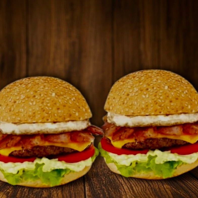 2 Hambúrguer (Pão, ovo, carne, salada, ketchup, queijo, presunto, requeijão, maionese de alho e batata palha)