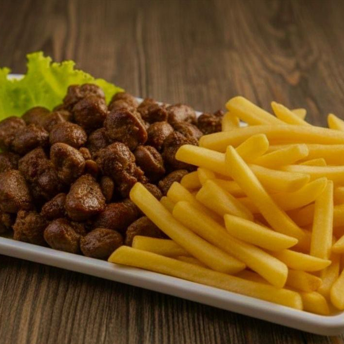 Batata frita, queijo, orégano, alho torrado, cheddar, requeijao, bacon, calabresa, 5 anéis de cebola e 5nugget