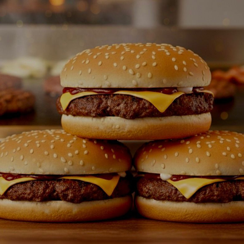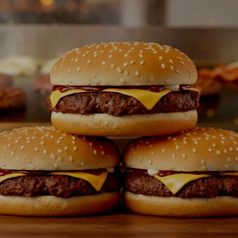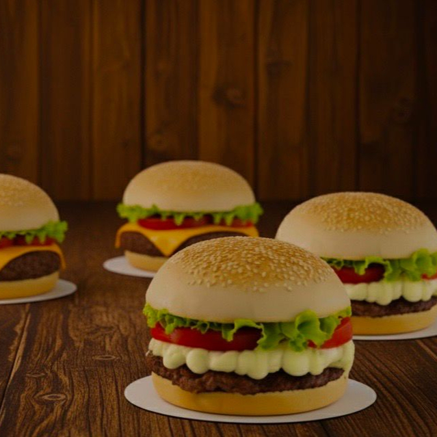 4 Hambúrgueres ( Pão, Carne, Salada, Ovo, Cheddar, Requeijão, Maionese de Alho e Batata Palha) + Batata (Bacon, Calabresa, Cheddar e Orégano) 2l