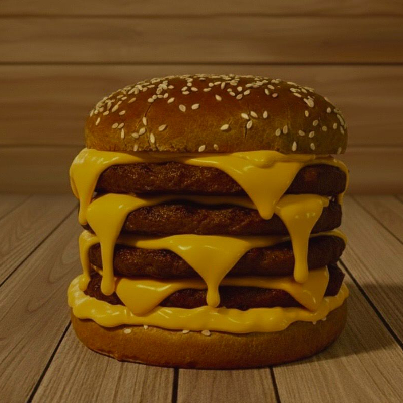 Pão, carne de picanha 120g, queijo, presunto, cheddar, calabresa, bacon, moaionese de alho, barbecue, 4 aneis de cebola, requeijão e batata palha.
