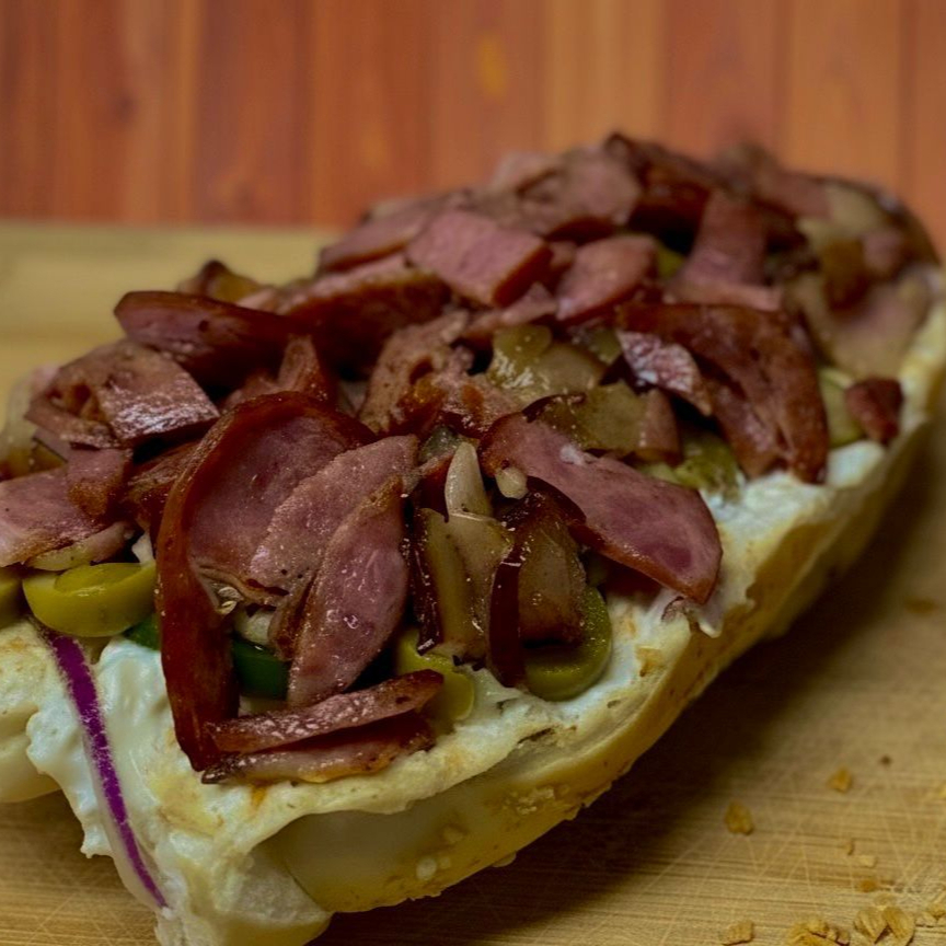 Pão, 2 carnes de picanha 120g, queijo, presunto, cheddar, calabresa, bacon, maionese de alho, barbecue, 4 aneis de cebola, requeijão e batata palha
