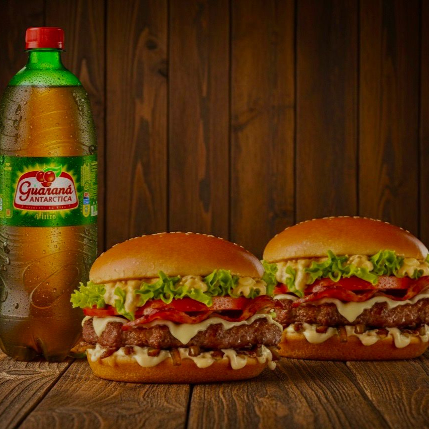 2 Hambúrgueres ( Pão, Carne, Salada, Ovo, Cheddar, Requeijão, Maionese de Alho e Batata Palha) + Batata (Bacon, Calabresa, Cheddar e Orégano) + 1l
