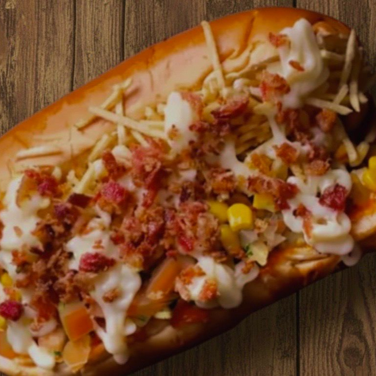 Pão, Salsicha ou Linguiça, Tomate, Cebola, Milho, Evilha, Azeitona, Ketchup, Maionese, Cheddar, Catupiry , passas molhos