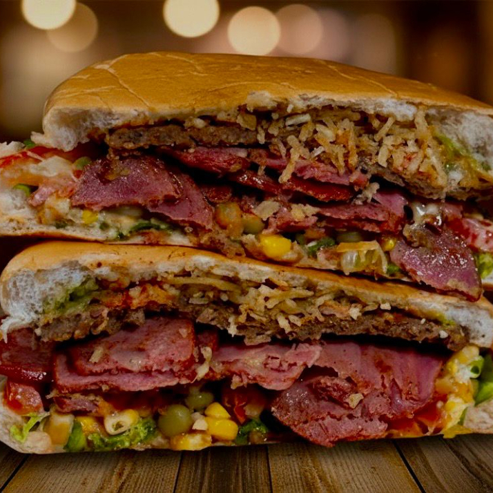 Pão, 3 carnes, presunto, queijo, ovo, maionese alho, billy jack, cebola crispy, batata palha, salada e requeijão