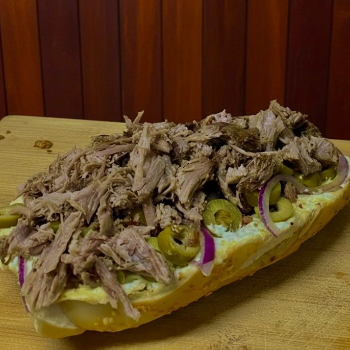 Pão, 4 carnes de picanha 120g, queijo, presunto, cheddar, calabresa, bacon, maionese de alho, barbecue, 4 aneis de cebola, requeijão e batata palha