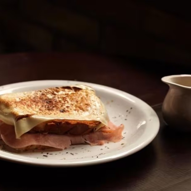 Pao macio com bastante manteiga, mostarda escura, mussarela e presunto, queijo mussarela maçaricado e molho bechamel