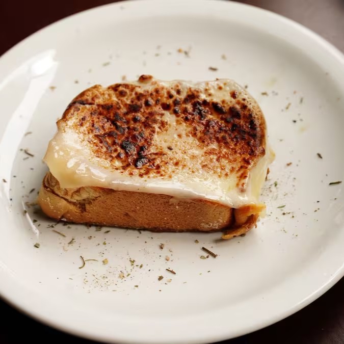 Pão macio com bastante manteiga e queijo mussarela maçaricado .