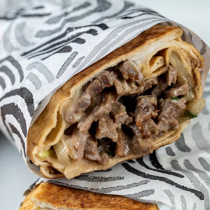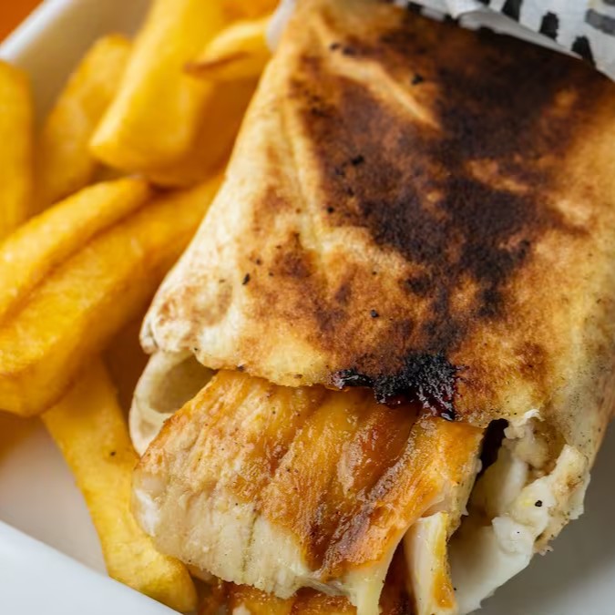 Queijo muçarela, queijo cheddar, tahine, molho de romã, salsa, cebola, picles, carne ou frango. Acompanhado de batata frita.