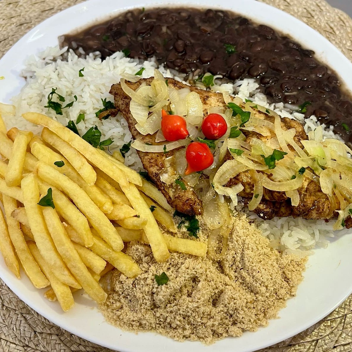 Filé de frango preparado na chapa, dourado por fora e suculento por dentro, finalizado com tempero especial da casa. Servido com arroz branco, feijão do dia, farofinha crocante e acompanhado de batata frita ou ovo.