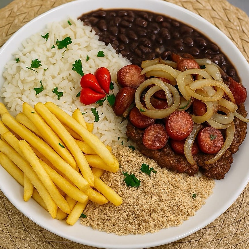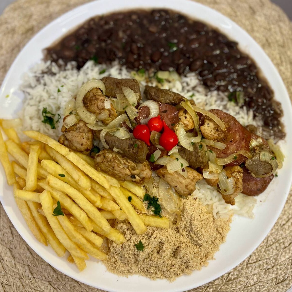 Tiras de carne, frango e calabresa preparadas na chapa, bem temperadas e suculentas. Acompanha arroz branco, feijão do dia, farofa e opção de batata frita ou ovo.